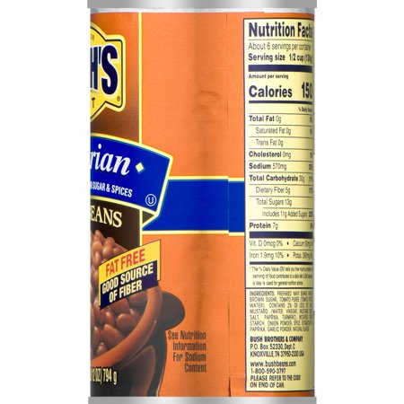 PDF SERVINGS PER #10 CAN: 280.74 46.79 ¼ cup servings per can VEGETABLE: ¼ ... Bush's Best 52.23 ® Baked Beans ¼ cup servings per can Calories Sodium Protein Sugars Total Fat Saturated Fat Trans Fat 80 270 mg 3 g 6 g 0 g 0 g 0 g SERVINGS PER CASE: UPC: 01637 VEGETABLE: ¼ CUP BEANS = ¼ CUP VEGETABLE SERVING MEAT/MA: ¼ CUP BEANS = 1 oz MEAT/MA 306.55 SERVINGS PER #10 CAN: Bush's Best 51.09 ® Vegetarian Baked Beans [Bush S Black Beans Nutrition Label] - 17 images - 30 baked beans ... 33 bush baked beans nutrition label labels for you, 33 canned pinto beans nutrition label online labels ideas, 30 ranch style beans nutrition label best labeling ideas, 34 bush s baked beans nutrition label labels information list, Bush's Baked Beans Nutrition | livestrong A 1/2 cup serving, or 130 g, of Bush's Baked Beans ranges from 110 to 160 calories. The lowest calorie options -- the Bold & Spicy and Vegetarian varieties -- contain 110 and 130 calories, respectively. Those containing the most calories, including the Boston Recipe, Country Style and Honey flavors, are made with more sweeteners. Bush's Best Brown Sugar Hickory Baked Beans - Shop Canned & Dried Food ... 28 oz. $2.55 ($0.10/oz) Icon details. Product description. When hamburgers and hot dogs are on your table, it only makes sense that Bush's Baked Beans go on the side. Our Brown Sugar Hickory Baked Beans recipe uses tender navy beans, slow-simmered in a slightly sweet sauce seasoned with brown sugar, a little mustard and a touch of savory ...