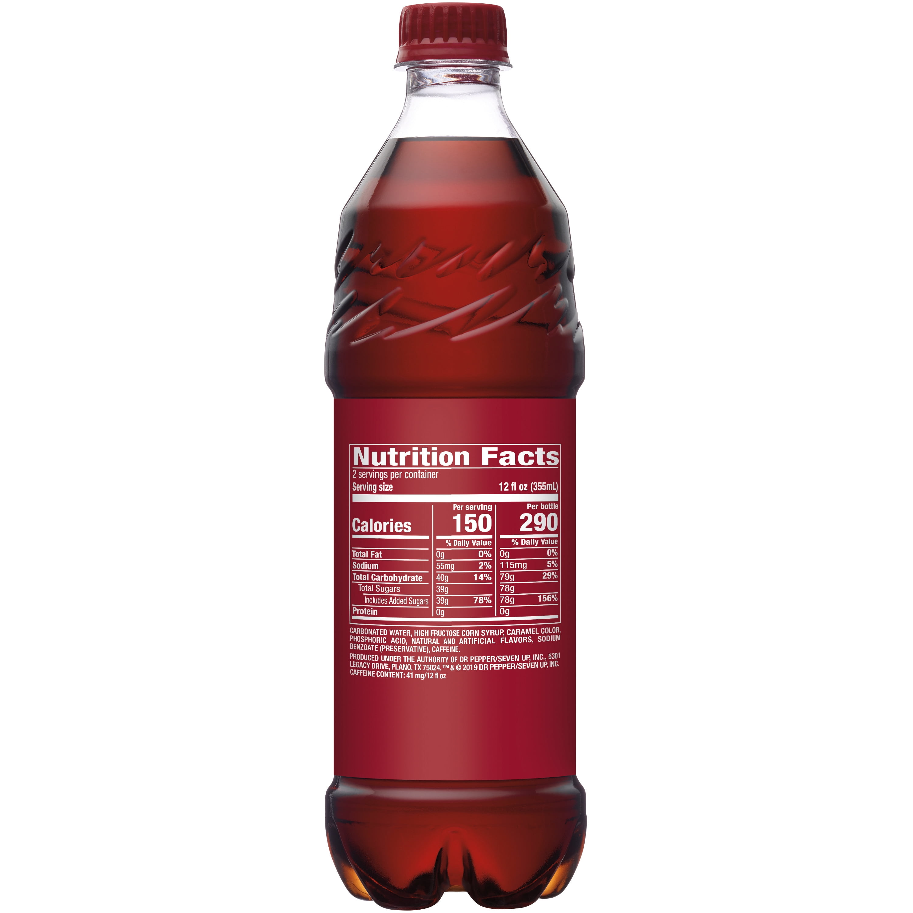 Calories in Dr. Pepper Dr. Pepper (16 oz) and Nutrition Facts There are 190 calories in 1 bottle (16 oz) of Dr. Pepper Dr. Pepper (16 oz). Get full nutrition facts for other Dr. Pepper products and all your other favorite brands. Home. Foods. Recipes. Search for food ... Dr. Pepper & Cream Soda (20 oz) Dr. Pepper Ten (Bottle) More Dr. Pepper Sodas Products. More products from Dr. Pepper. Candy Twists. Keurig Dr Pepper Product Facts The Keurig Dr Pepper product facts website provides the latest nutrition and ingredient information so you can make informed choices. ... Welcome to Keurig Dr Pepper Product Facts. ... Learn more about the brands you love and find your new favorites! See All Products. 7UP. 7UP. Size: 20 fl oz: Calories: 240: Total Fat: 0 g: Sodium: 65 mg: Carbs ...