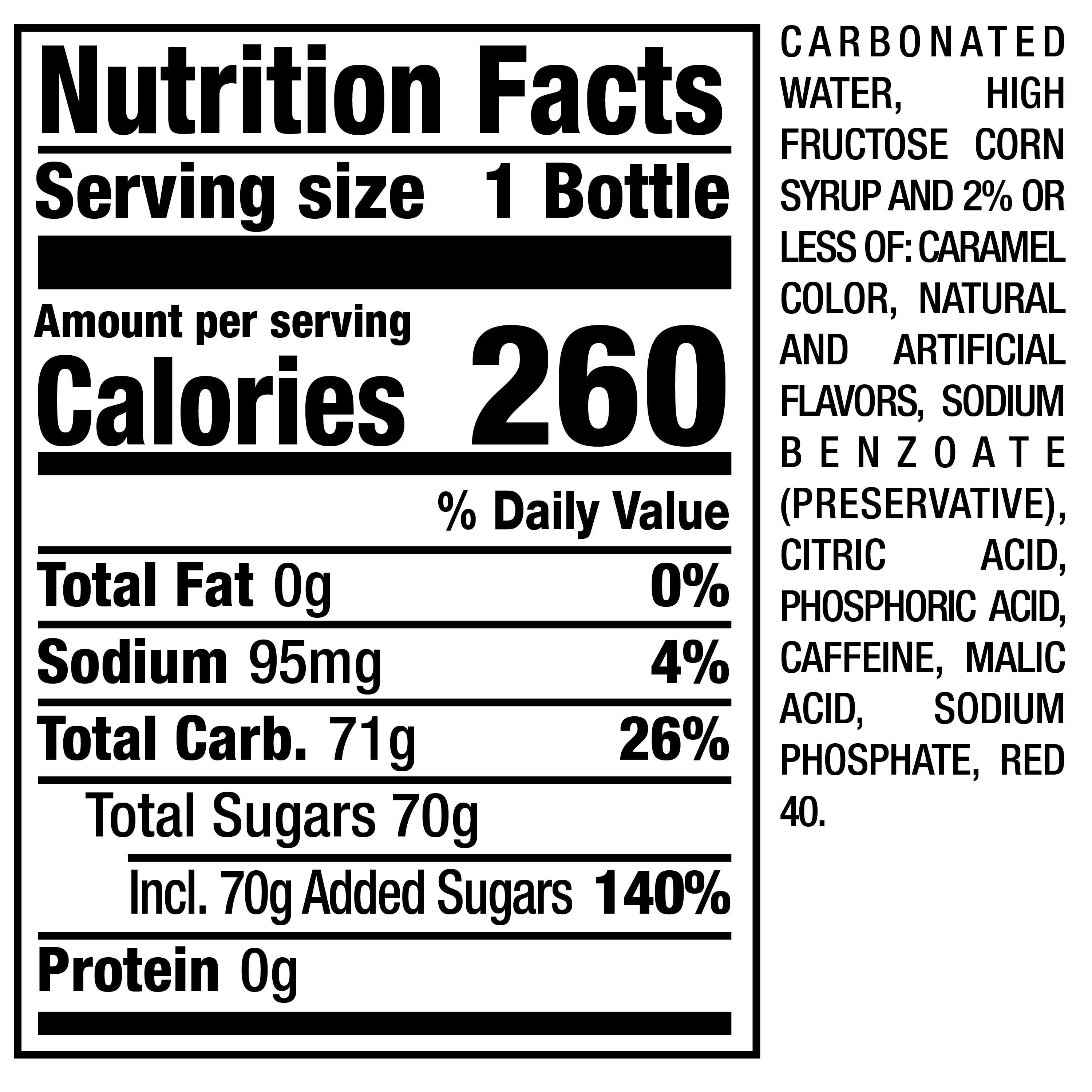 Keurig Dr Pepper Product Facts Sodium. 90mg. 4%. Total Carbohydrates. 76g. 28%. Total Sugars. 75g. Sugars are carbohydrates that occur naturally, such as those in juices, vegetables, grains and milk, and can be added to foods or beverages in the form of granulated or liquid sugar, corn syrup and honey, for example. The Facts About Your Favorite Beverages (U.S.) | product Available package sizes. Click to view. 20 fl oz 7.5 fl oz 8 fl oz 12 fl oz 16 fl oz 16.9 fl oz 24 fl oz 33.8 fl oz 42.2 fl oz 67 fl oz Freeze Fountain. mountaindew.com. Where To Buy. Product Fact Sheet. Nutrition information is rounded as required by the FDA which is why values sometimes look inconsistent when comparing different sizes. Carbs in Beverages Dr. Pepper 20 Oz Beverages Dr. Pepper 20 Oz (1 serving) contains 65g total carbs, 65g net carbs, 0g fat, 0g protein, and 230 calories.