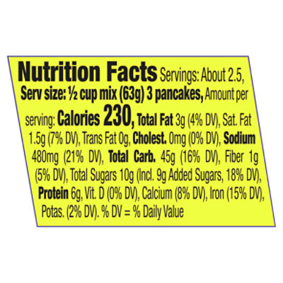 Betty Crocker Bisquick Original Pancake & Baking Mix - Instacart To reduce fat and cholesterol in your favorite Bisquick recipes: (1) Use skim milk in place of whole or low-fat milk. (2) Use margarine in place of butter. (3) Use egg whites or egg substitute for whole eggs (1 large egg = 2 egg whites or 1/4 cup egg substitute). To Measure Bisquick Mix: Spoon into dry-ingredient measuring cup; level with knife. Bisquick Pancake Mix, Buttermilk: Calories, Nutrition ... - Fooducate Bisquick Pancake Mix, Buttermilk nutrition grade N/A 230 Calories Per Serving 3 comments Rating: 3.75 with 44 ratings 3 followers Explanations 2.5 tsp of added sugars per serving Added sugars are sugars and syrups that are added to foods or beverages as part of their preparation. Calories in Bisquick Pancakes - Calorie, Fat, Carb, Fiber, & Protein ... Calories In Heart Smart Bisquick Pancakes w/1% milk (serving size one pancake) Calories: 74 , Fat: 2g , Carbs: 13g , Protein: 3g , Fiber: 0g Calories In Heart smart Bisquick pancakes