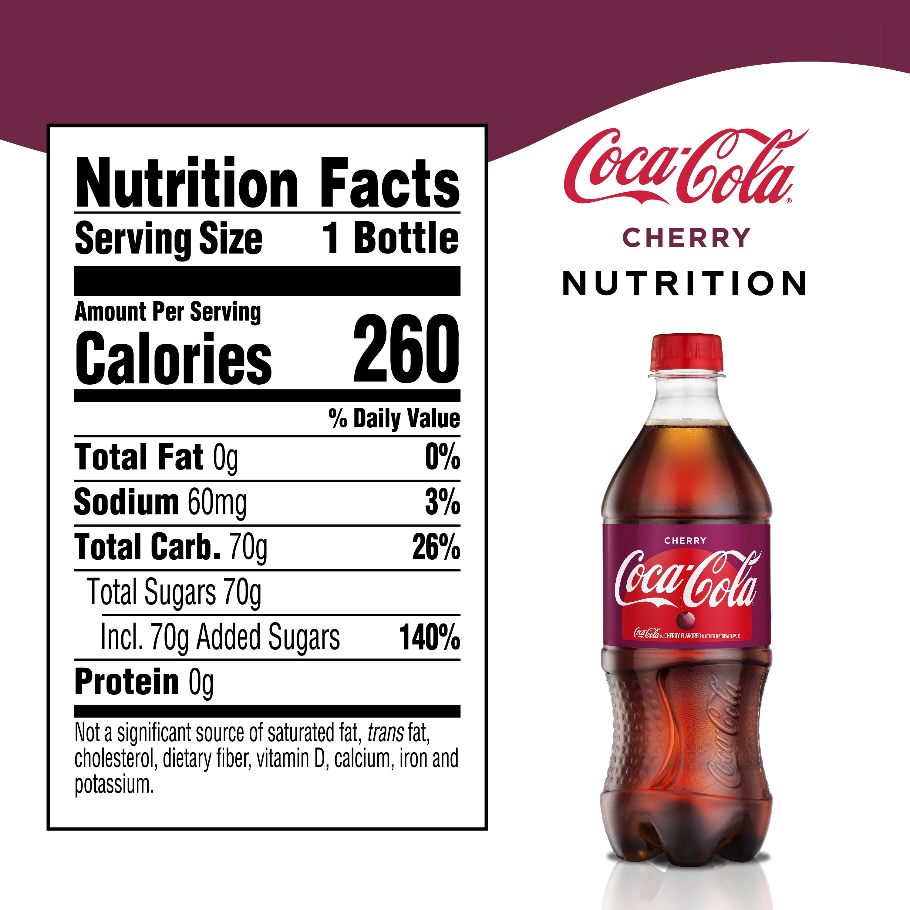 Calories in Coca-Cola Coca-Cola (Bottle) and Nutrition Facts - FatSecret There are 215 calories in 1 bottle (500 ml) of Coca-Cola Coca-Cola (Bottle). Calorie Breakdown: 0% fat , 100% carbs, 0% prot. Related Drink Mixes from Coca-Cola: Calories in Coca-Cola Coca-Cola Classic (20 oz) and Nutrition Facts Coca-Cola Classic (20 oz) Nutrition Facts Serving Size 1 bottle (20 oz) Amount Per Serving Calories 240 % Daily Values* Total Fat 0.00g 0% Saturated Fat 0.000g 0% Trans Fat 0.000g Polyunsaturated Fat 0.000g Monounsaturated Fat 0.000g Cholesterol 0mg 0% Sodium 75mg 3% Total Carbohydrate 65.00g 24% Dietary Fiber 0.0g 0% Sugars 65.00g Protein 0.00g Coca-Cola® Cherry | Coca-Cola® Cherry soda just got a new look with Coca-Cola® Cherry. Try this sweet cola drink today, available for purchase in stores and online! ... 12 fl oz, 12 Pack. 12 fl oz, 12 Pack . 7.5 fl oz, 6 Pack ... After select the vendor the page will be reloaded. BUY NOW. Walmart ToGo. Amazon Fresh. Amazon Prime Now. Shop Now. VIEW NUTRITION FACTS. Details ...