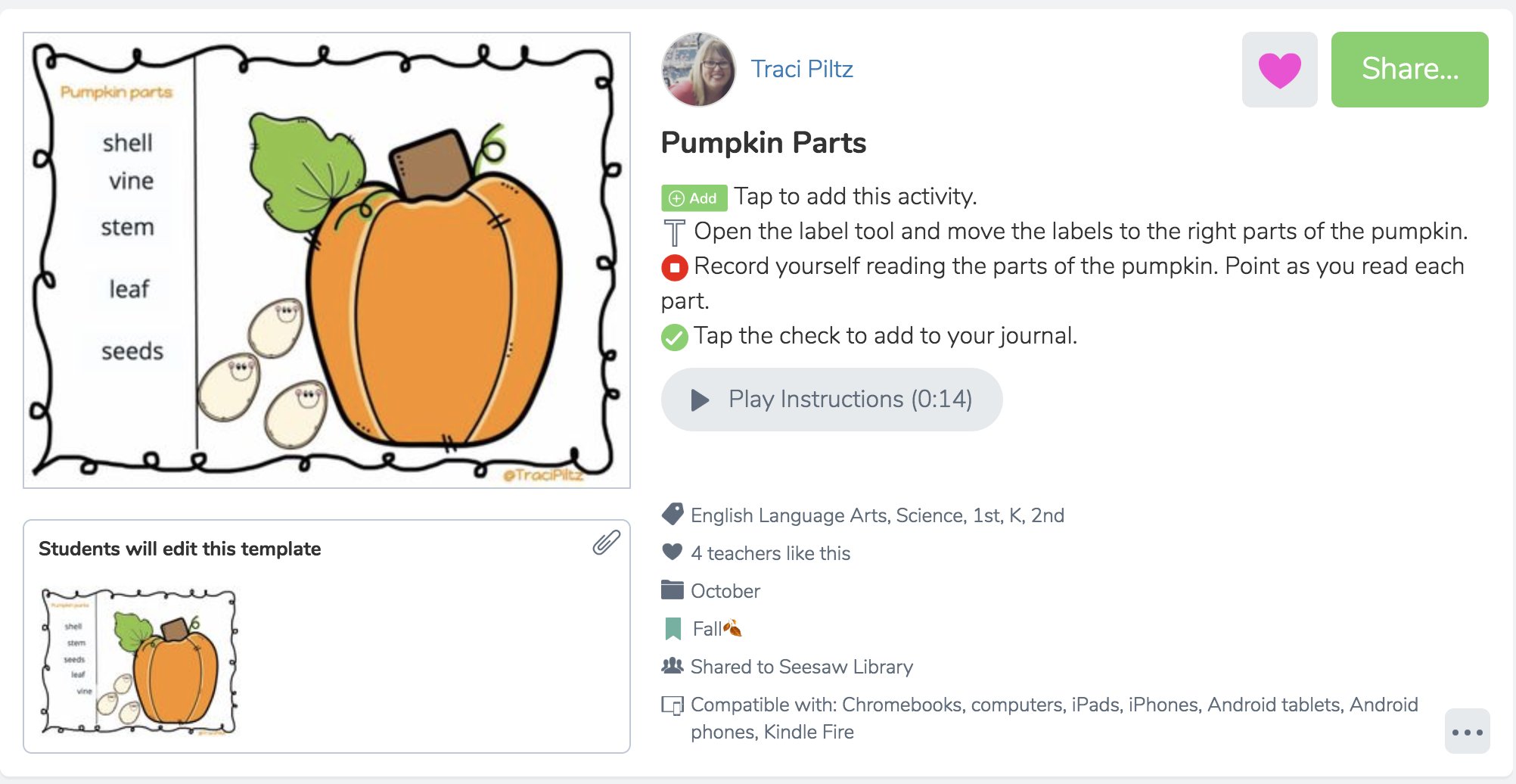 Pumpkin Fact Cards and Labeling Activity Packet I've put together this fun activity packet where students will match the pumpkin picture part with the fact card about that part. (There are 2 different sets of fact cards depending on the needs of your students.)Then students will label the parts of the pumpkin. If you would like to download this freebie just click on the image below. Thanks ...
