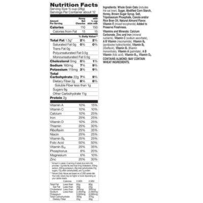 Nutrition In Honey Nut Cheerios - HoneyLoveTalk.com While Honey Nut Cheerios is rich in 13 vitamins and minerals, as the packaging claims, iron, folate, and zinc are among the most prevalent. According to the University of California San Francisco, iron is essential for healthy blood, which functions to transport oxygen to cells all around the body. Chocolate Cheerios Cereal by General Mills - Nutritionix Are Cheerios Gluten-Free? 12 Enticing Options It may come in handy in future label reading. Vitamin E Vitamin E is fat-soluble and often found in many vegetable oils, cereals, meat, poultry, eggs, and fruits. It is an antioxidant and is required for the function of multiple human organs. Cheerios use this to preserve the cereal's freshness; it is naturally gluten-free. Nutrition Label For Honey Nut Cheerios - HoneyLoveTalk.com General Mills Honey Nut Cheerios.190 calories per container.Naturally flavored. Sweetened whole grain oat cereal with real honey & natural almond flavor.Simply made gluten free grown, milled, toasted.No artificial flavors.No artificial colors. Nutrition Facts Gluten free.27g whole grain per serving at least 48g recommended daily.