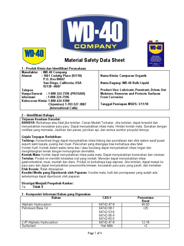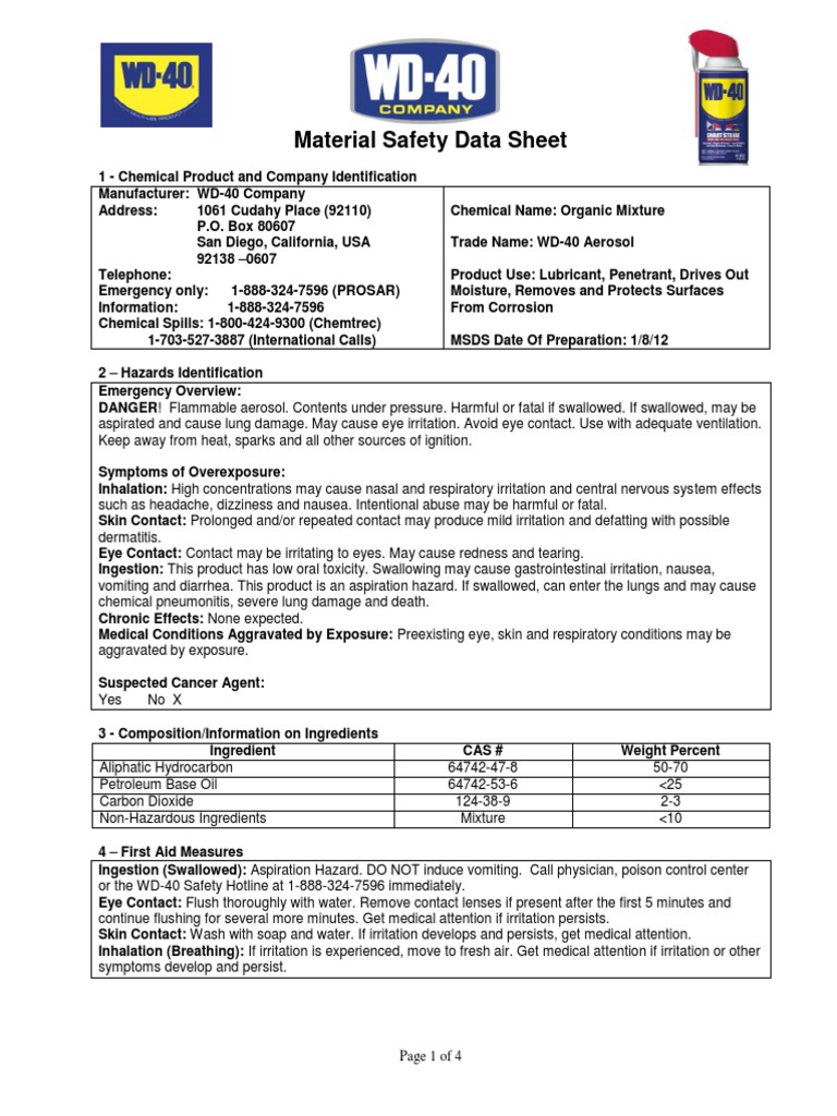 Wd40 whmis. WD-40® Specialist® PROTECTIVE WHITE LITHIUM GREASE WD-40® SPECIALIST® PROTECTIVE WHITE LITHIUM GREASE is ideal for metal-to-metal ... this product are listed on the TSCA inventory; Canadian WHMIS ... SAFETY DATA SHEET Jan 22, 2020 ... WD-40® Multi-Use Product - Aerosol. Container size: 100 ml, 125 ml, 150ml, 200 ml, 240 ml, 250 ml, 300 ml, 400 ml, 420 ml. Aerosol - Material Safety Data Sheet (MSDS) and Containers Regulations (CCCR) which take precedence over WHMIS 2015 labeling. The actual ... the WD-40 Safety Hotline at 1-888-324-7596 immediately. WD40 Lubricant Multipurpose 11oz Aerosol Can -60 to 300 °F Known as “the can with a thousand uses,” WD-40 protects metal from rust and corrosion, lubricates stuck parts, displaces moisture, and lubricates just about ...