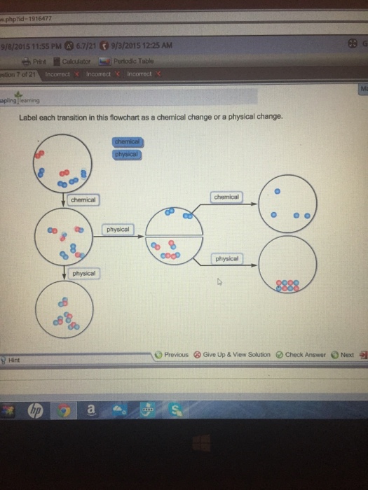 Label each transition in this flowchart as a chemical change or a physical change.. Solved Identify each transition in this flowchart as a | Chegg.com Question: Identify each transition in this flowchart as a chemical change or a physical change. physical chemical o 8 chemical 8. chemical chemical Answer Bank chemical physical Show transcribed image text Expert Answer 100% (2 ratings) Transcribed image text: Flowchart Of Chemical Or Physical Change - Realtec Realtec Flowchart Of Chemical Or Physical Change Find and download Flowchart Of Chemical Or Physical Change image, wallpaper and background for your Iphone, Android or PC Desktop. Realtec have about 41 image published on this page. Flowchart for Naming Chemical Compounds Pin It Share Download Sapling hw 1 Flashcards | Quizlet Wrong: Brass (Solid solution from copper and zinc) Salt and Water (mix together, nothing change) Label each transition as a physical or chemical change. Chemical change: 1 blue element attached to another red element. Separate elements. Physical change: Element cant separate and can change from gas, liquid or solid. Identifying Physical and Chemical Changes Flashcards | Quizlet 6th grade identify each term as either Chemical Change, Physical Change, Chemical Property, or Physical Property Terms in this set (26) Wood Burning Chemical Change Silver tarnishing Chemical Change Wood being carved Physical Change Water evaporating Physical Change Dynamite exploding Chemical Change Dry ice changing to carbon dioxide gas