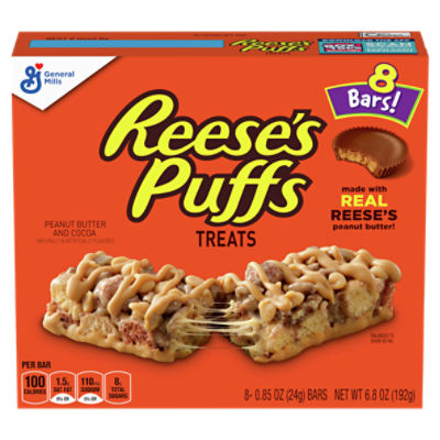 Calories in Reese's Puffs Treats and Nutrition Facts - FatSecret Calories 110 Fat 3.5g Carbs 16g Protein 2g There are 110 calories in 1 bar (24 g) of Reese's Puffs Treats. Calorie breakdown: 30% fat, 62% carbs, 8% protein. Related Snacks from Reese's: Dipped Pretzels Drizzled Popcorn Popped Snack Mix Creme Puffs Snack Mix Snack Mix (Package) find more reese's snacks products More Products from Reese's: