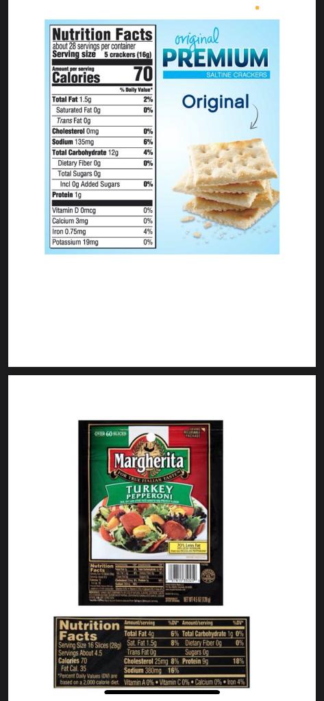 Saltine nutrition label. Calories in Saltine Crackers - Nutritionix Saltine Crackers ; Calories 13 ; % Daily Value* ; Total Fat 0.3g grams 0% Daily Value ; Saturated Fat 0.1g grams 0% Daily Value ; Trans Fat 0g grams. Saltine Crackers - Nutrition Label Amount/Serving. %DV*. Amount/Serving · Total Fat 1.3g. 3 Tot. Carb. 10.3g · Sat. Fat 0g. 0 Dietary Fiber 0g · Trans Fat 0g. Sugars 0g · Cholesterol 0mg. Protein ... Nutrition Facts for Premium Original Saltine Crackers • MyFoodDiary® Nutrition Facts ; Fat 20.6% ; Carbs 73.3% ; Protein 6.1% ... Saltine Crackers, Original, Fresh Stacks, Premium - Nutritionix Saltine Crackers, Original, Fresh Stacks, Premium ; Total Fat 1.5g grams. 2% Daily Value ; Trans Fat 0g grams ; Cholesterol 0mg milligrams. 0% ...
